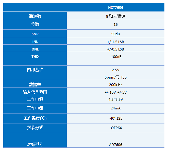 HCT7606是16位、 8通道同步采样的模数转换器芯片。 HCT7606内置了模拟输入钳位保护、 二阶抗 混叠滤波器、 跟踪保持放大器、 16位电荷再分配逐次逼近型模数转换器、 灵活的数字滤波器、2.5V基准电压源、 基准电压缓冲以及高速串行和并行接口。